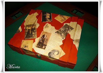 Esta caja también era de botellas de vino, encontrada en un contenedor, una vez hecho todo el tratamiento, lijar, pintar, decoupage, barnizar y envejecer ha quedado así. Se la he regalado a mi amigo Fco.Sergio para que guarde las fotos antiguas.