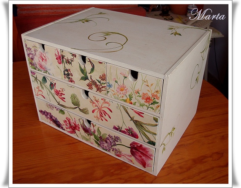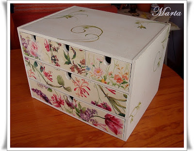 Era la primera cajonera que hacia y me costó un montón, está hecha con servilletas y la parte de arriba y laterales están adornados con unos rabitos en verde.