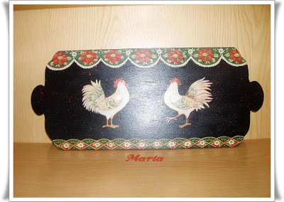 Esta bandeja fue de lo primero que hice en clase de manualidades, está pintada de negro, hecho un salpicado y pegado los gallos y el adorno de los lados, después barnizada.