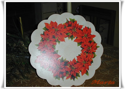 Estos bajoplatos están decorados con motivos navideños, combinando láminas y pintura a mano.