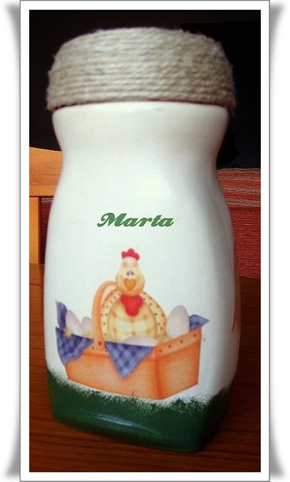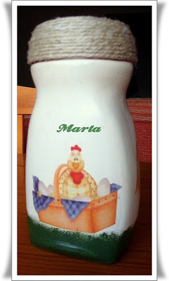 Nunca había decorado botes de cristal y un día me puse a experimentar, cogí un bote de Nescafe, le dí imprimación, lo pinté con esponja, por abajo le dí esponjeado verde y le puse unas gallinitas, no sabía como hacer la tapa y se me ocurrió cubrirla toda con cuerda, el resultado no está mal del todo.