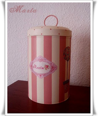 Le he puesto unas rayas en color rosa chicle y en la tapa unos lunares del mismo color.