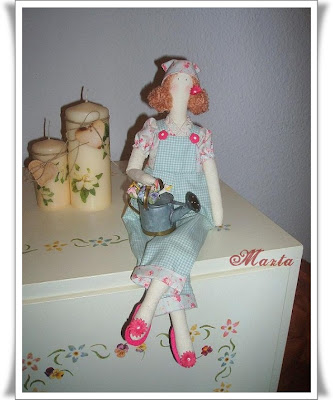 Por fin acabé la tilda jardinera, está hecha "a mi manera", no he seguido los patrones de la revista, los pantalones son del espantapájaros tilda y la camisa una adaptación también.