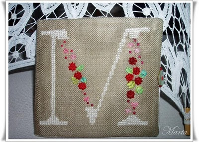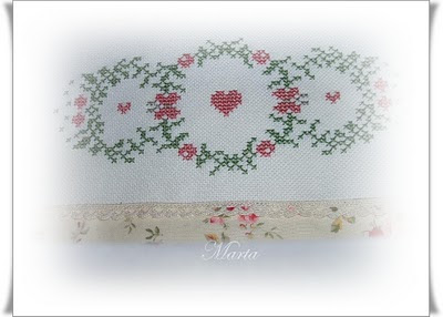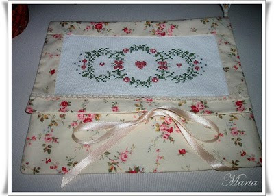 La bolsita la trajo un día a casa, la habia hecho para una amiga y me encantó nada más verla, pues aquí la teneis, hizo otra para mi. Es de una delicadeza total, parece que no la haya tocado ningunas manos, el bordado es precioso, espero que se puedan apreciar los detalles, se ata con una cinta que tiene un corazón ¡divino!