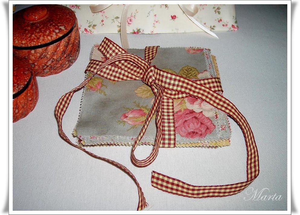 Tambien sabía que me habian encantado unas telas que ella habia utilizado en un guardabloques, yo las estuve buscando pero no las encontré, aquí las teneis, me hizo un paquetito con una cinta holandesa que es una preciosidad.