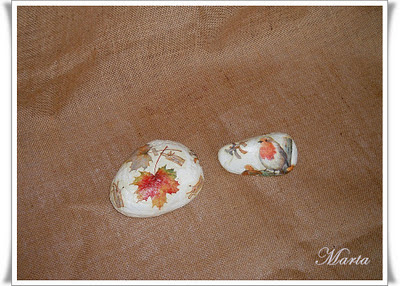 Estas piedras las traje de la finca, les he hecho un decoupage con la misma servilleta del mueble anterior y otra con un pajarito en los mismos tonos, la grande la usamos como sujetapuertas y la pequeña como pisapapeles.