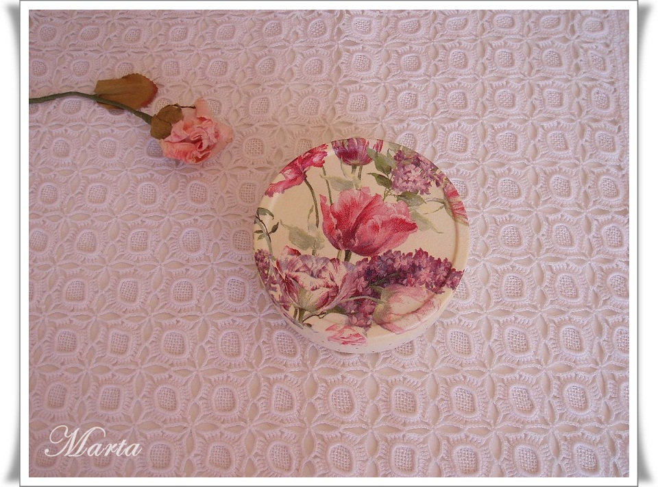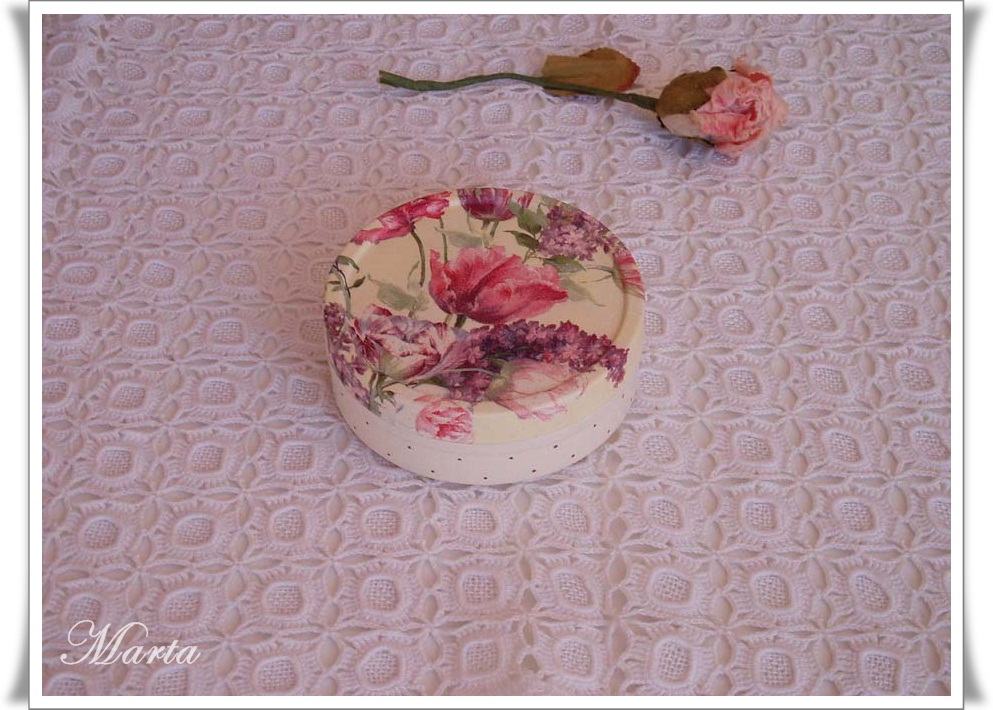 Hola Marta! hermosa la cajita! tenes el don de transformar lo simple en algo bellisimo!la bandeja monisima y que decir del alfiletero que recibiste de regalo. una ternura!