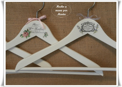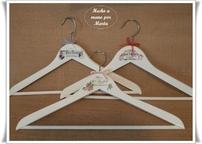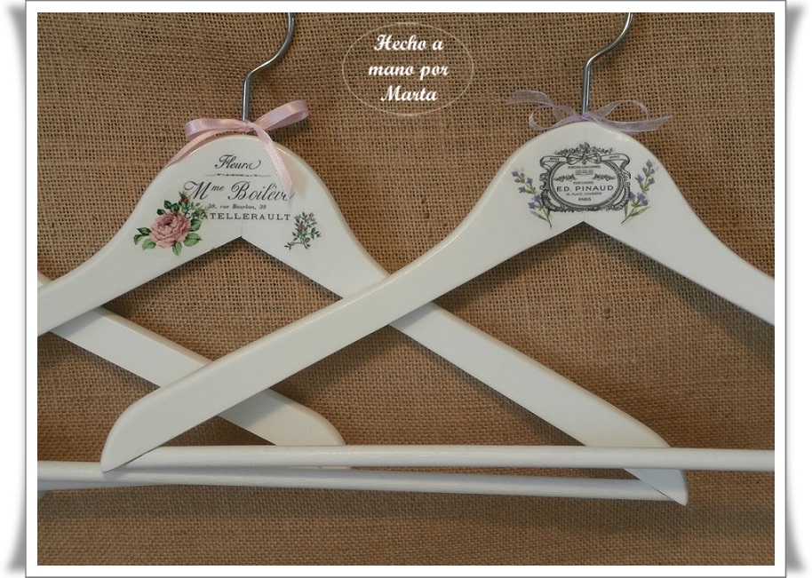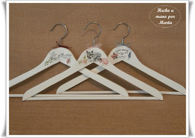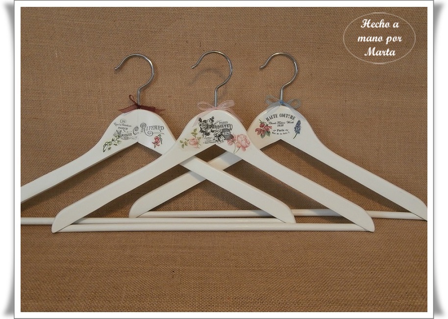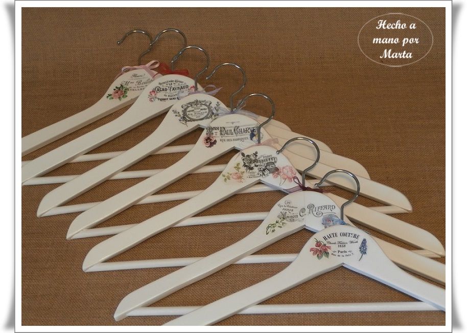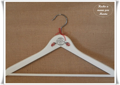 Hoy os dejo unas perchas hechas con transfer y servilletas, quedan preciosas y en el armario lucen mucho. Estas han sido un encargo, menos la de la mariquita que se la quedó mi hija, pues le encantó, luego tuve que hacer otra para sustituir a esa pero ya no me acordé de hacerle foto.