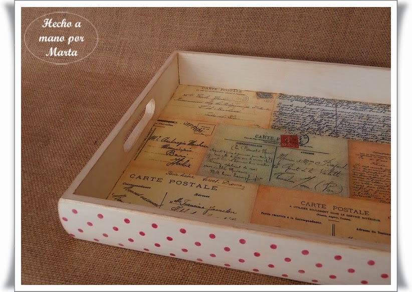 Una bandeja con una lámina que a mi me encanta, unos lunares y un poco de envejecido, quedó muy bonita y creo que le gustó.