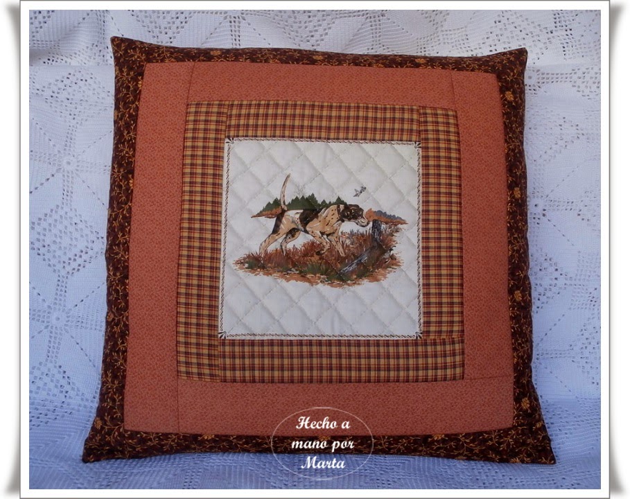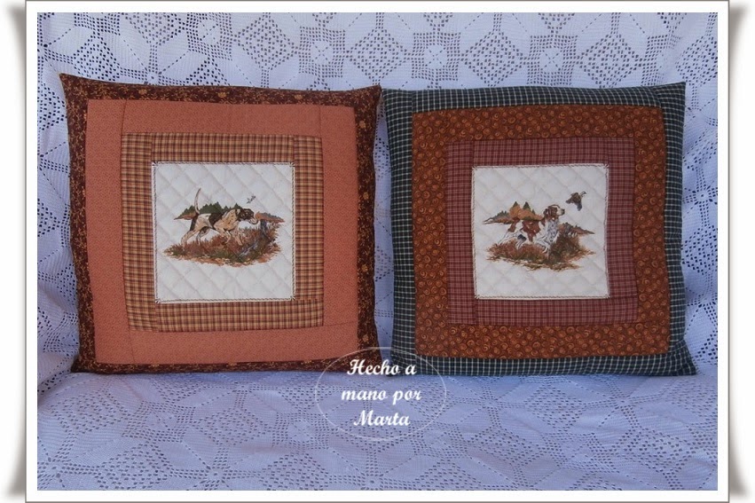 Me regalaron estos dos kits para hacer unos cojines de patchwork hace tiempo, pero no me atrevía pues no estoy yo muy ducha en estos asuntos, así que aprovechando que ha estado aquí mi hermana Loly, que es la reina del patchwork, (ya os he enseñado algún trabajo de ella), me ayudó con el montaje y ya por fin están listos y colocados en su sitio.