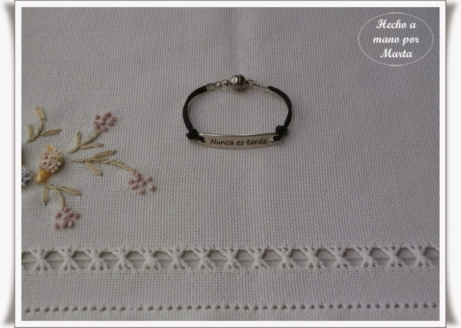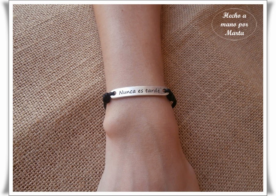 Unas pulseras con una placa que lleva un mensaje, la primera con cierre de imán y la segunda con elástico, me parece genial la idea pues es muy cómoda de poner.
