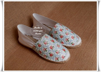 Es la primera vez que hago este tipo de alpargatas y hubiera sido más fácil poner unos recortes con dibujos pues al ser la servilleta entera me costó un poco, pero creo que el resultado está bastante bien.