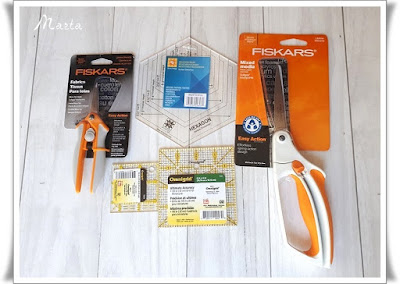 Estos caprichos de patchwork me los ha regalado mi querida amiga Mari Loli, sabe que me estoy iniciando y tengo lo justo de materiales, las tijeras son maravillosas y las reglas me vienen de lujo, la plantilla de hexágonos es genial.